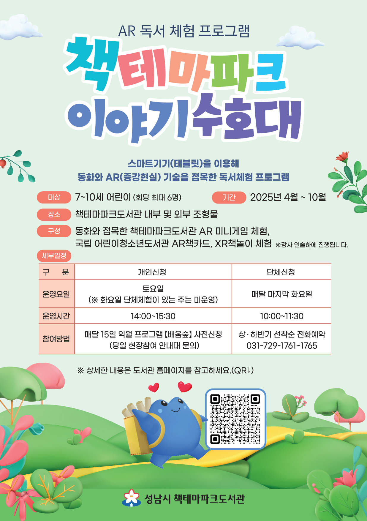 율동공원에 위치한 책테마파크도서관에서는 책테마파크도서관의 특색있는 조형물을 배경으로 동화와 접목하여 개발한 AR(증강현실) 체험 프로그램 운영을 통해 어린이들의 독서 흥미를 유발하고 편하게 도서관을 방문할 수 있도록 하고자 합니다. 많은 이용 바랍니다. ○ 운영기간: 2025. 4월 ~ 10월 (6개월, 월 4회) ※ 8월 미운영 ○ 운영장소: 책테마파크도서관 내 · 외부 ○ 운영대상: 관내 7~10세 어린이 및 단체/ 회당 최대 6명 ○ 내 용: 테블릿에 설치된 AR 어플리케이션을 이용하여 도서관 조형물과 동화를 접목하여 개발한 증강현실 미니게임 체험, |