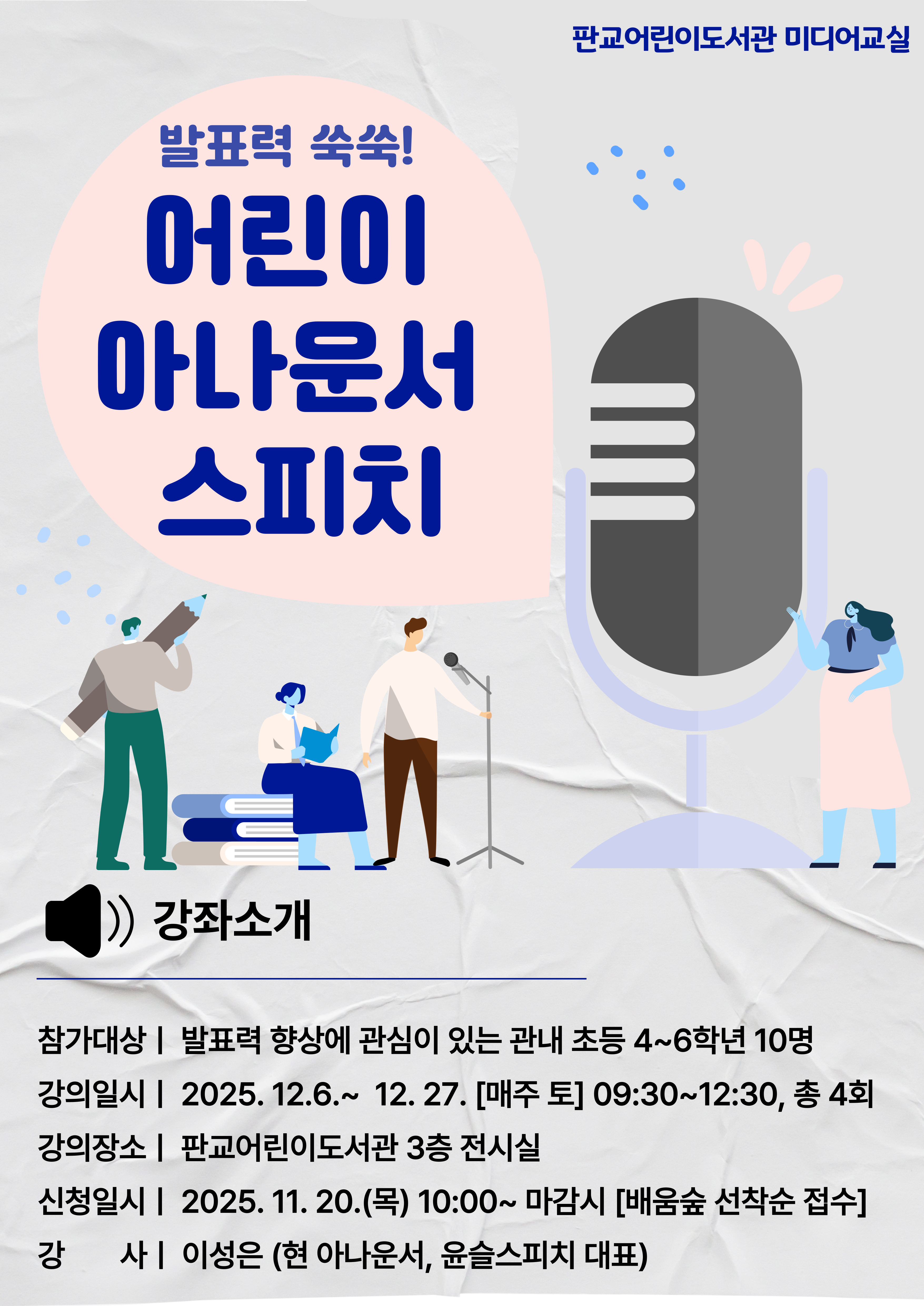 ![]() ![]() ![]() 2025년 판교어린이도서관 미디어교실 2기 수강생 모집 안내 ☐ 운영과목: ''발표력 쑥쑥! 어린이 아나운서 스피치’ 등 3개 강좌 ☐ 운영기간: 2025. 12. 6.(토) ~ 12. 27.(토) [과목별 상이] ☐ 모집기간: 2025. 11 20.(목) 10시 ~ 마감 시 ☐ 모집방법: 평생학습포털 배움숲 선착순 모집