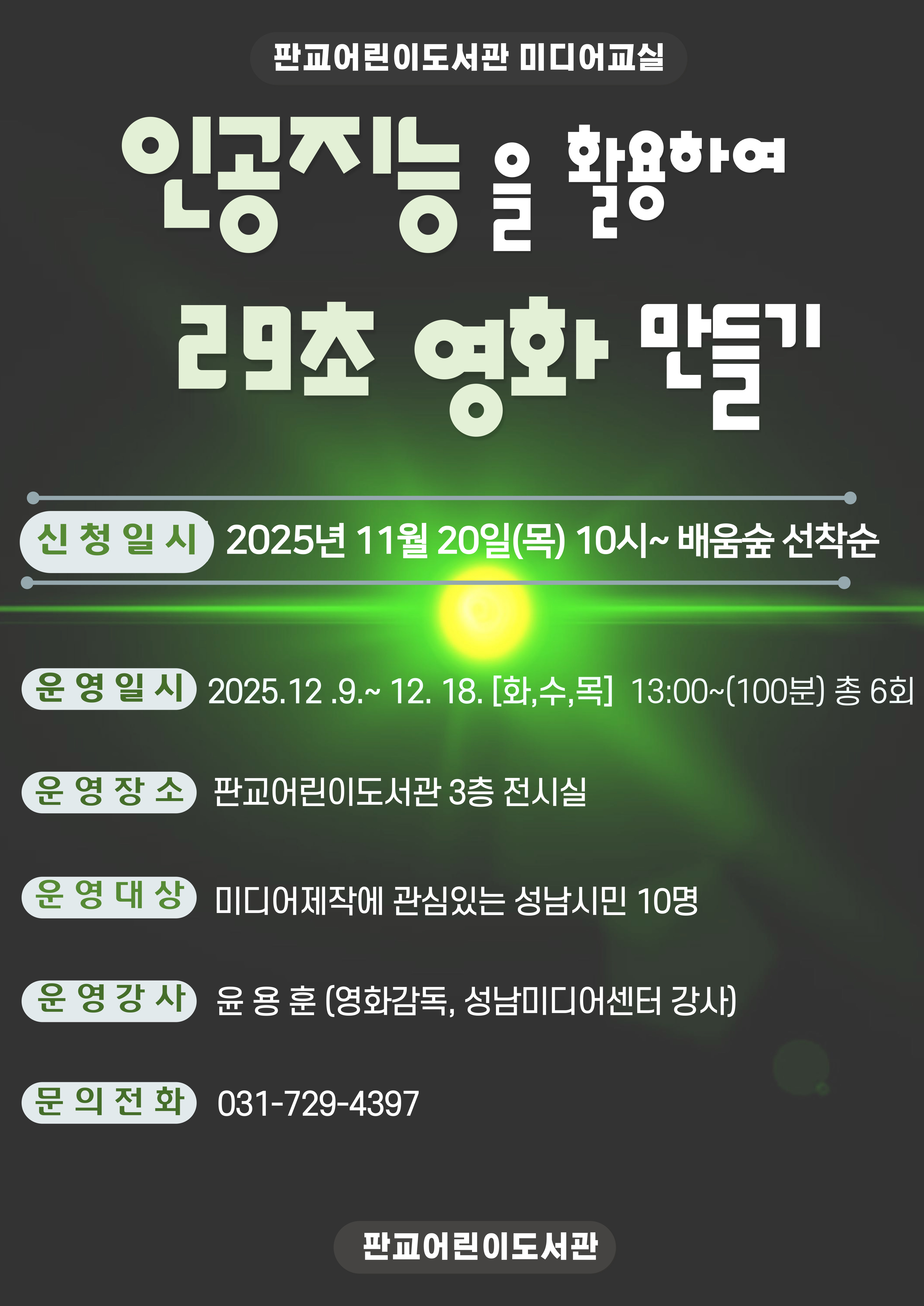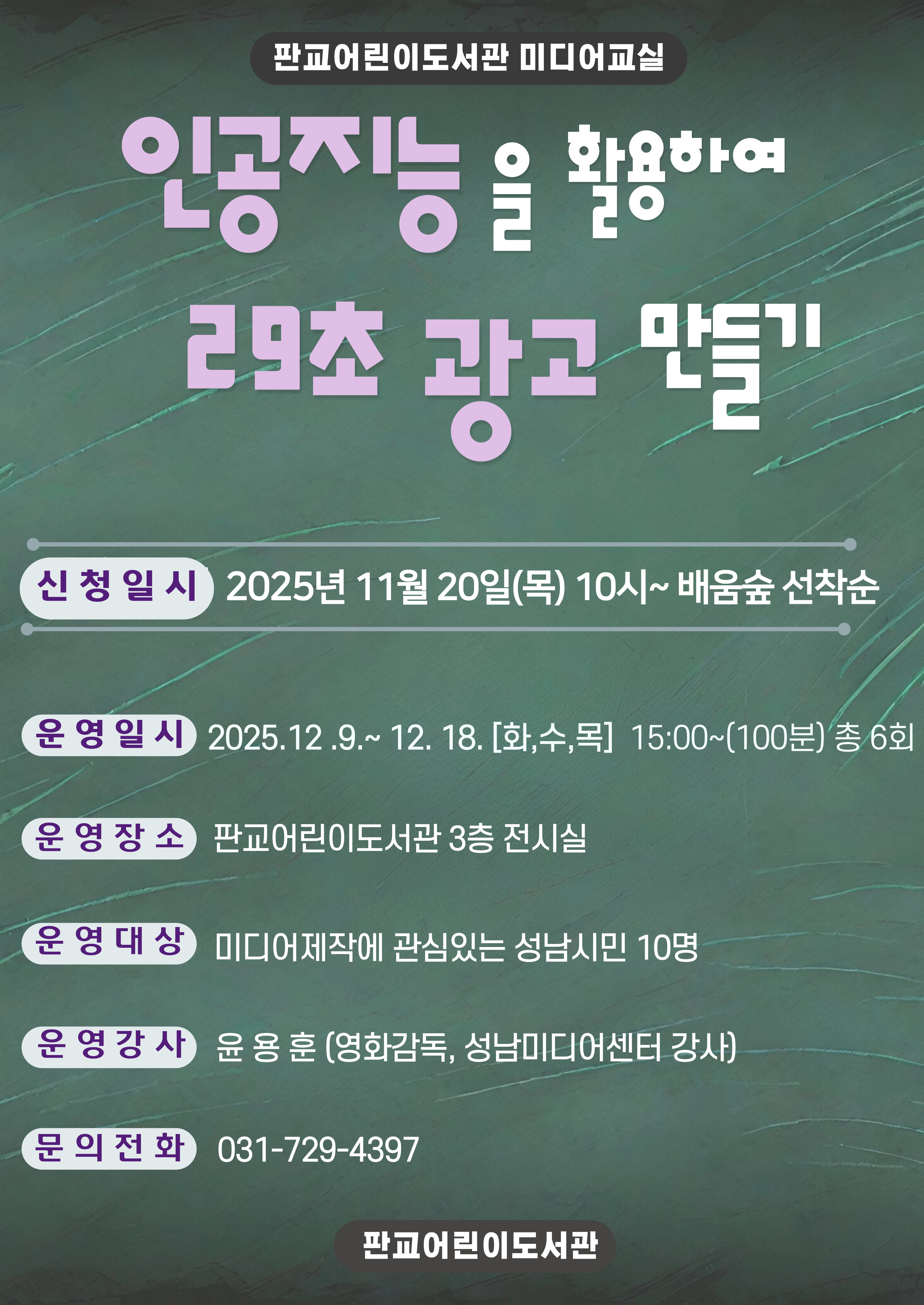 | 제목 | 2025년 판교어린이도서관 미디어교실 2기 수강생 모집 안내 | ||||||||||||||||||||