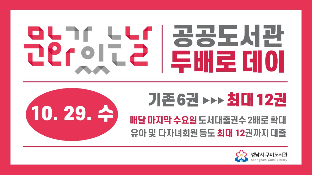 ![]() 10월 29일 수요일, 경기도 문화의 날 '문화가 있는 날' ○ 매달 마지막 수요일, 도서관과 함께하는 공공도서관 두배로 데이 - 구미도서관 문헌정보실, 어린이실 도서대출권수 2배 (DVD 제외) - 당일 하루만 기존 6권에서 최대12권까지 대출권수 확대 - 유아 및 다자녀회원도 12권까지만 대출 가능 |