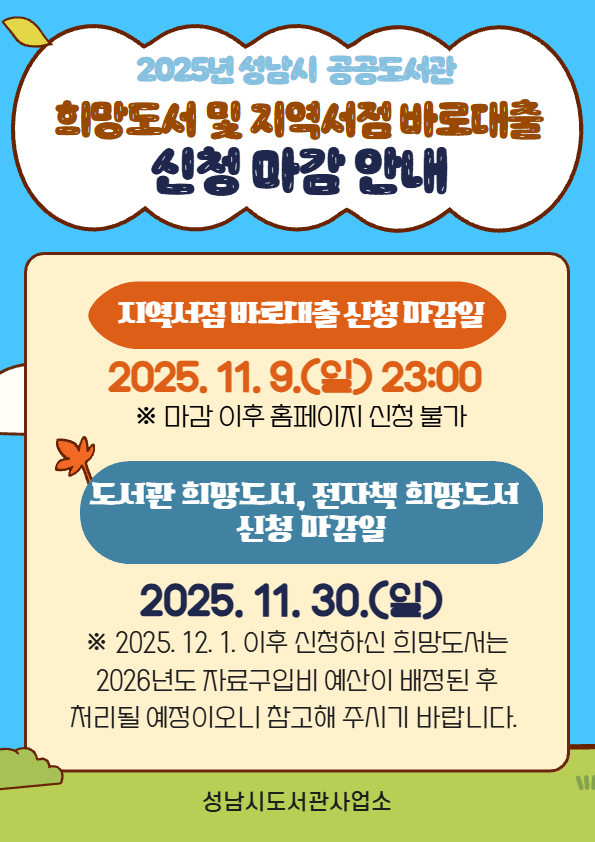 | 제목 | 2025년 성남시 공공도서관 지역서점 바로대출 및 도서관 희망도서 신청 마감 안내 |