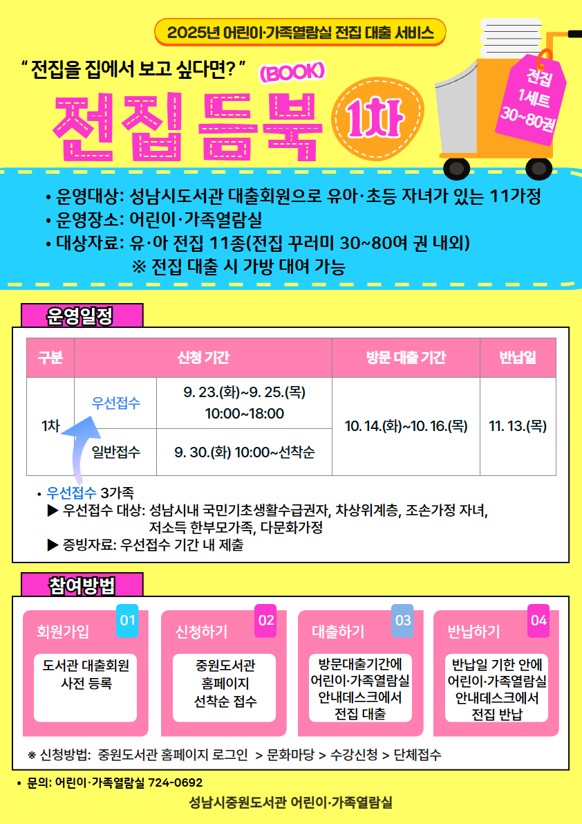 ![]() - 2025년 어린이·가족열람실 전집 대출 서비스 - 1차 「전집듬북(BOOK)」 운영 안내 □ 운영일정 - 신청기간 • 우선접수: 9. 23.(화)~9. 25.(목) 10:00~18:00 • 일반접수: 9. 30.(화) 10:00~선착순 - 방문 대출 기간: 10. 14.(화) 10:00~10. 16.(목) 17:00 - 반납일: 11. 13.(목) ※ 차시별 우선접수 3가족 이내 ▶ 우선접수 대상: 성남시내 국민기초생활수급권자, 차상위계층, 조손가정 자녀, 저소득 한부모가족, 다문화가정 ▶ 증빙자료: 우선접수 기간 내 제출 □ 운영대상: 성남시도서관 대출회원으로 유아·초등 자녀가 있는 가정 □ 운영장소: 중원도서관 어린이·가족열람실 □ 대상자료: 유아·초등 저학년 전집 11세트(1세트 30~80권) (※ 전집 선정도서 목록은 첨부파일 확인!) □ 운영내용 ❍ 책 꾸러미 운영 방법 ▶ (1단계) 회원가입: 도서관 대출회원 사전 등록 ▶ (2단계) 신청하기: 중원도서관 홈페이지 선착순 접수(홈페이지 로그인>문화마당>수강신청>단체접수) ▶ (3단계) 대출하기: 방문 대출 기간에 어린이·가족열람실 안내데스크에서 전집 대출 ▶ (4단계) 반납하기: 반납일 기한 안에 어린이·가족열람실 안내데스크에서 전집 반납 ※ 전집 대출/반납은 어린이가족열람실 데스크에서만 가능 (※ 반납함 반납 및 상호대차 불가) ※ 무거운 전집 대출 시 가방 대여 가능 |