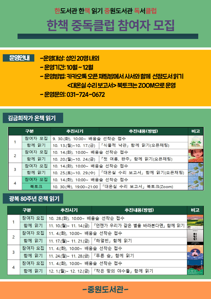 한책 중독 클럽(한도서관 한책 읽기 중원도서관 독서클럽) 운영 - 운영대상: 성인 20명 내외 - 운영기간: 10월 ~ 12월 - 운영방법 - 카카오톡 오픈 채팅방에서 사서와 함께 선정도서 읽기 - <대온실 수리 보고서> 북토크는 ZOOM으로 운영 - 각 주차별로 함께 읽고 싶은 책 배움숲에서 선착순 접수 - 김금희작가 온책 읽기와 광복 80주년 온책 읽기 4회 모두 참여시 기념품 증정(에코백+볼펜) **중복참여 가능** - 운영문의: 031-724-0672 ![]() |