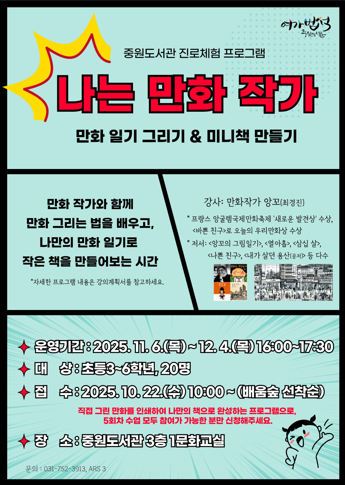 ![]() ※ 배움숲 접수창으로 ☞ < 성남시 평생학습 통합플랫폼 - 배움숲 (seongnam.go.kr)> - 공공도서관 독서프로그램 지원- 진로체험 프로그램 <나는 만화 작가> 참여 안내 ○ 운영기간: 2025. 11. 6.(목)~ 12. 4.(목) 16:00~17:30 ○ 대 상: 초3~6학년, 20명 ○ 접 수: 2025. 10. 22.(수) 10:00~ 배움숲 ○ 내 용: 만화 작가와 함께 만화 그리는 법을 배우고, 나만의 만화 일기로 미니책 만들기 ○ 장 소: 3층 1문화교실 ○ 수강료 및 재료비 무료 ※ 직접 그린 만화를 인쇄하여 나만의 책으로 완성하는 프로그램으로 5회차 수업 모두 참여가 가능한 분만 신청해주세요. |