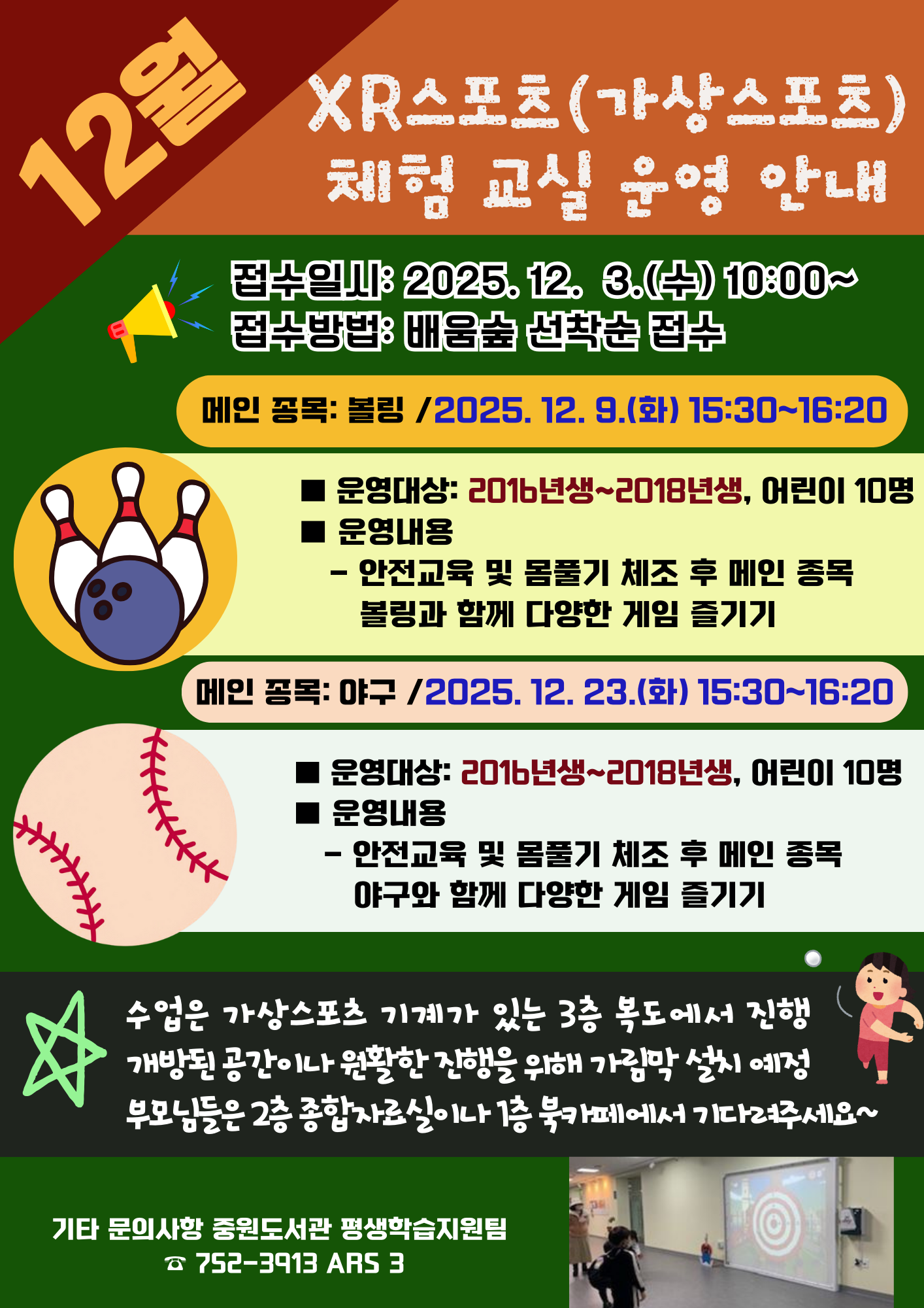 ![]() 2025년 12월 XR스포츠(가상스포츠) 체험 교실 운영 안내 ○ 운영장소: 중원도서관 3층 가상스포츠존 ○ 접수일시: 2025. 12. 3.(수) 10:00~ ○ 접수방법: 배움숲 선착순 접수 바로가기 -> 1차 ■ 운영일시: 2025. 12. 9.(화) 15:30~16:20 ■ 운영대상: 2016년생~2018년생, 어린이 10명 ■ 운영내용: 안전교육 및 몸풀기 체조 후 메인종목인 볼링과 함께 다양한 게임하기 2차 ■ 운영일시: 2025. 12. 23.(화) 15:30~16:20 ■ 운영대상: 2016년생~2018년생, 어린이 10명 ■ 운영내용: 안전교육 및 몸풀기 체조 후 메인종목인 야구와 함께 다양한 게임하기 수업은 가상스포츠 기계가 있는 3층 복도에서 진행 개방된 공간이나 원활한 진행을 위해 가림막 설치 예정 부모님들은 2층 종합자료실이나 1층 북카페에서 기다려주세요 기타 문의사항 중원도서관 평생학습지원팀 ☎ 752-3913 ARS 3 |